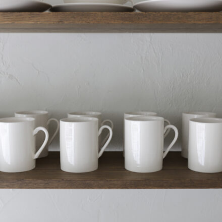 テーブルから垂直に立つ直線的なシルエットに、品の良い持ち手が印象的な「コーヒーマグ」。様々な空間に調和する、バランスの取れたデザインです。