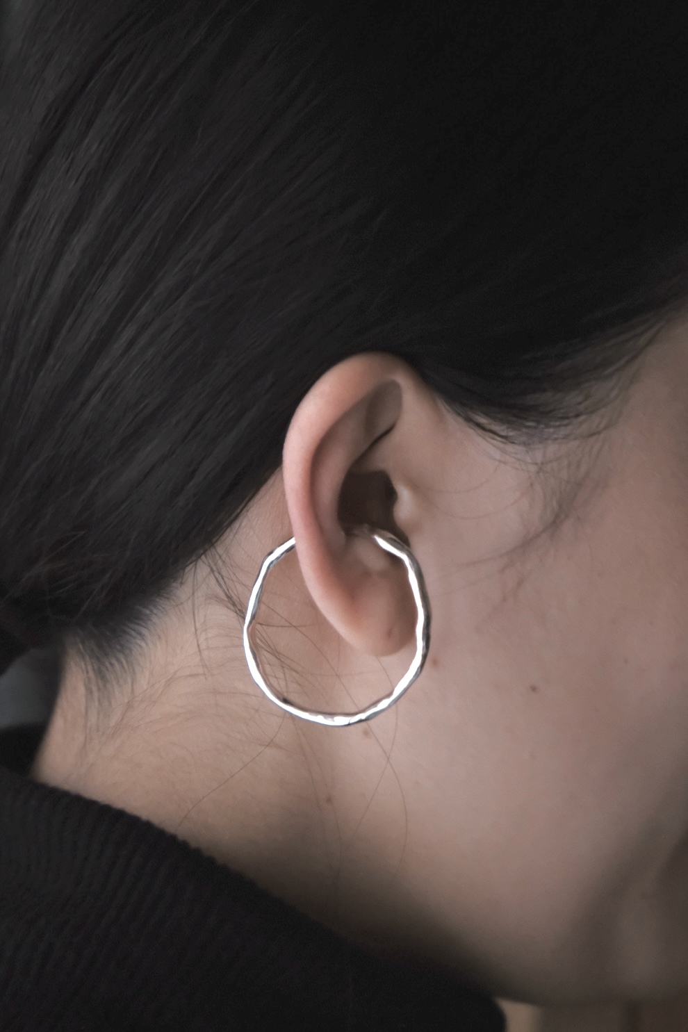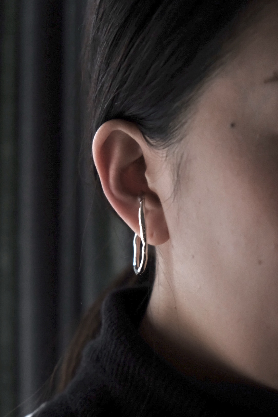 Play シリーズは手で捏ねて成形したクレイワックスを原型に制作。クレイワックスの不定形なフォルムや柔らかな質感が、金属素材に新鮮な表情とぬくもりを与えています。”Play ear cuff L” は歪な形状が変化に富んだ光の反射を見せてくれるイヤカフ。有機的な印象の造形が耳元に彩りを添えてくれます。