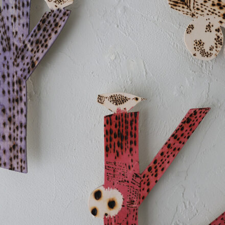 プライウッドの生地を生かし、コテでの焼き付けによるディテールで、動植物や身近なアイテムを切り取り表現しています。コテをたくみに使い、ドットや焼き付けの強弱で描いた作品は、味わい深い仕上がり。