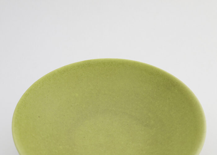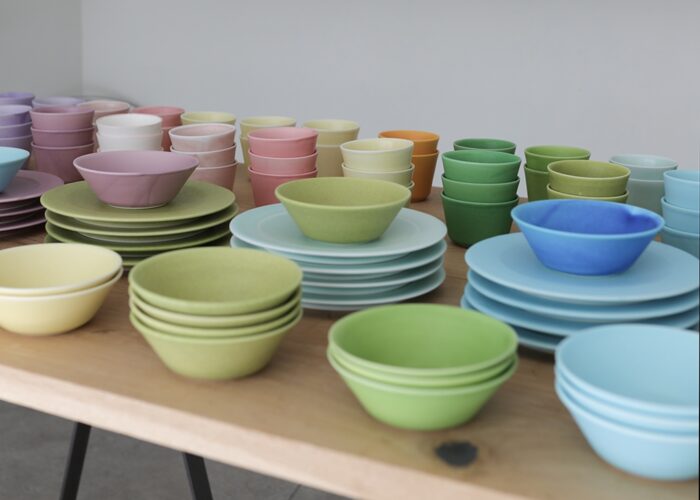 鮮やかな色合いからニュアンスのある微妙なトーンまで、軽やかで自在な色彩感覚を特徴に、半磁器土を素材に用いてロクロで制作をしている吉村さん。マットな釉薬を使うことで、艶や反射のない穏やかさの中に色彩を表現しています。