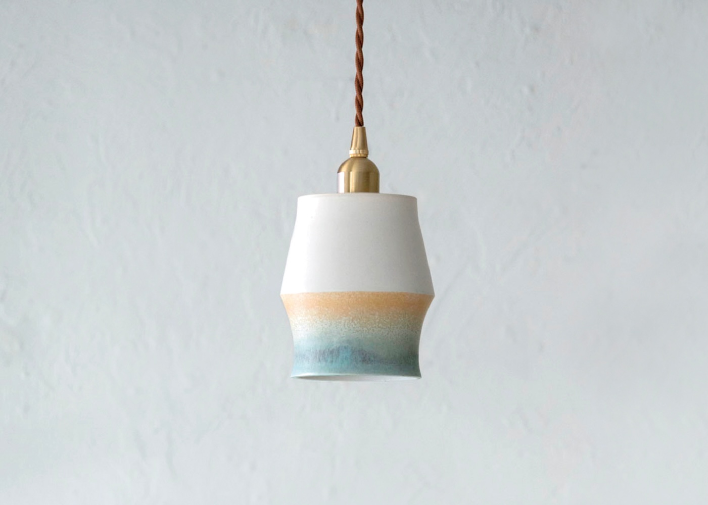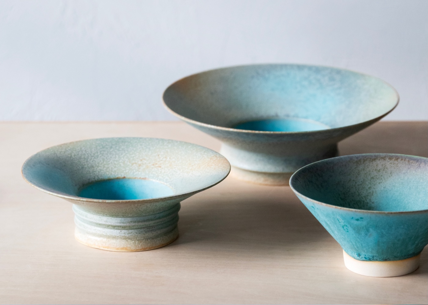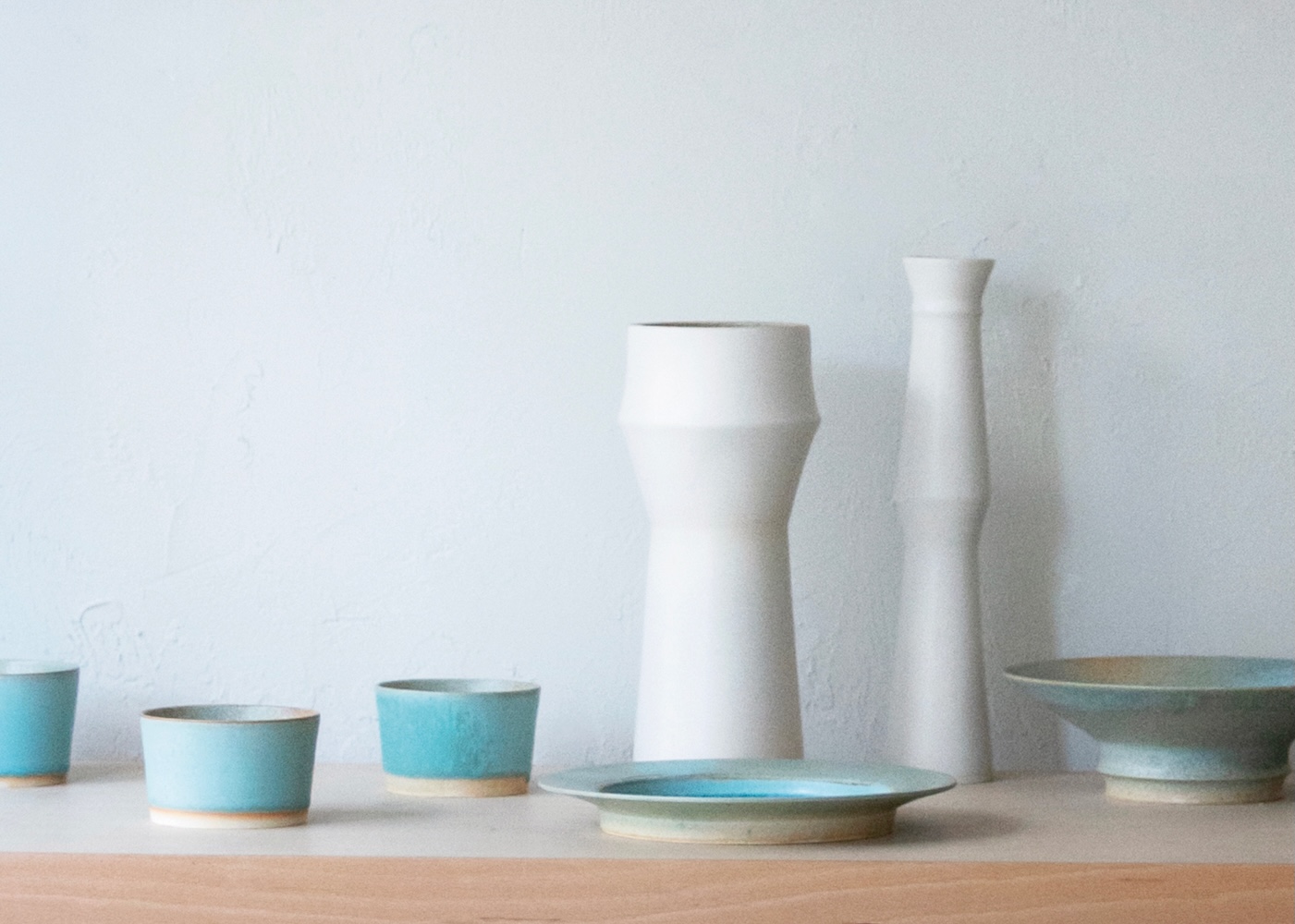ランドスケープ写真から抽出した青、茶、白のイメージが反映された陶器。